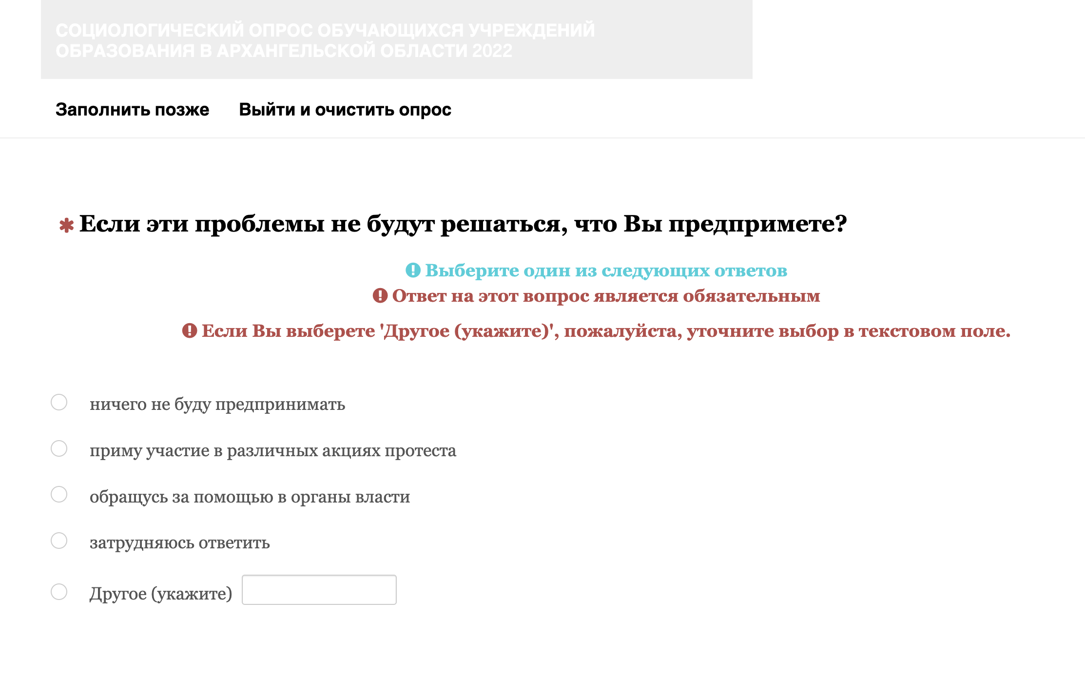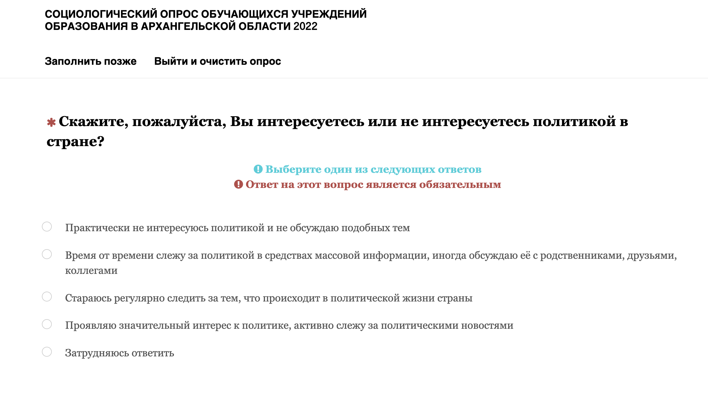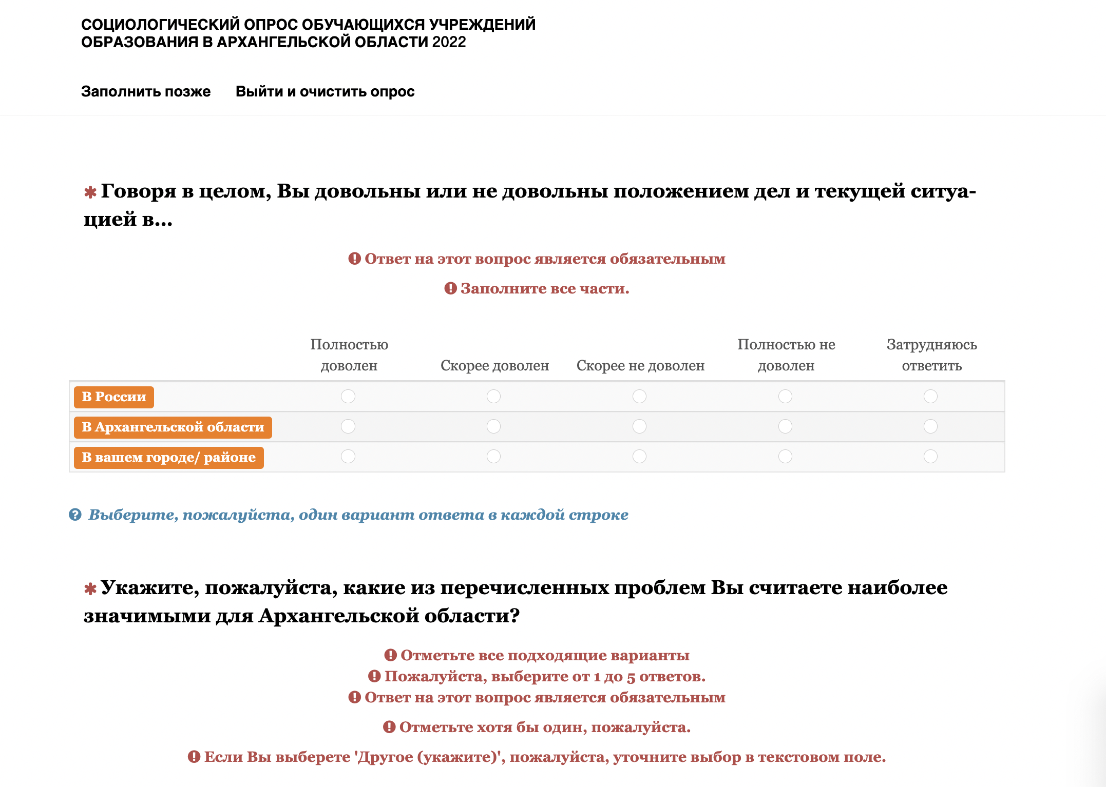 Помимо прочего, у школьников поинтересовались, как они относятся к деятельности губернатора Архангельской области Александра Цыбульского, какие проблемы в области они считают наиболее значимыми и что они планируют предпринимать, если эти проблемы не будут решаться. Также там есть вопросы о том, удовлетворены ли ученики своей жизнью, что они думают об экстремизме и как относятся к людям разных национальностей и других религий.
