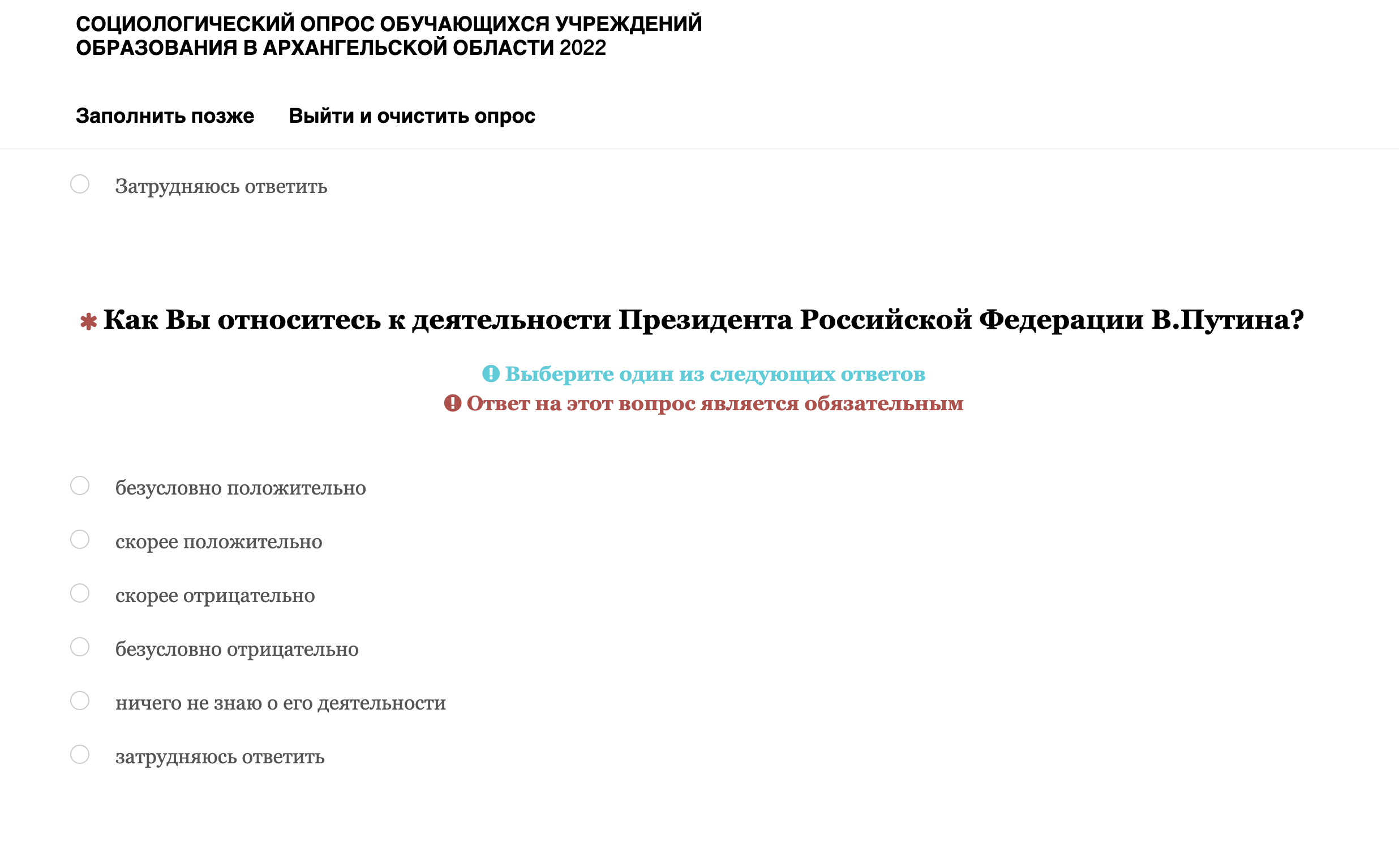 В Архангельской области учеников 10–11 классов заставляют пройти «анонимный» онлайн-опрос, в котором пытаются выяснить их отношение к президенту России Владимиру Путину, готовность участвовать в протестах и наличие симпатии к «террористам и экстремистам». Об этом сообщили The Insider в «Альянсе учителей», информацию подтвердил один из получивших ссылку на опрос школьников.