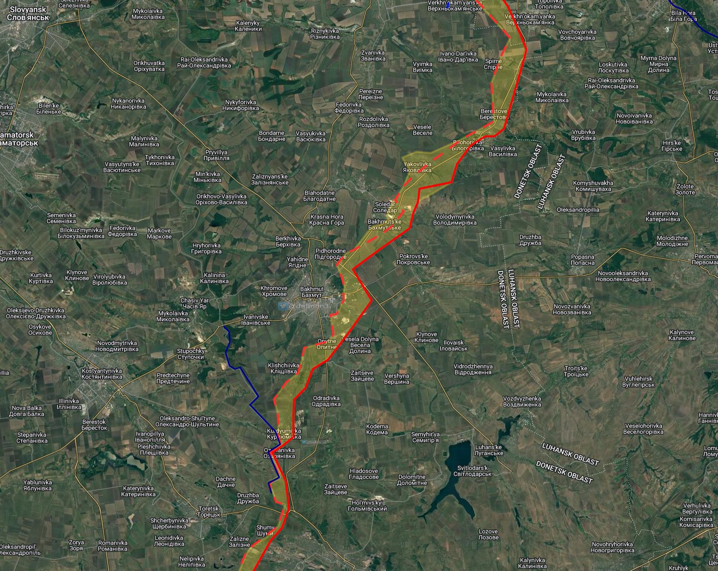 Def Mon публикует карту продвижения российских военных в районе Бахмута за последние три месяца, на которой видно, что, несмотря на ожесточённые бои, удалось захватить всего два поселка.