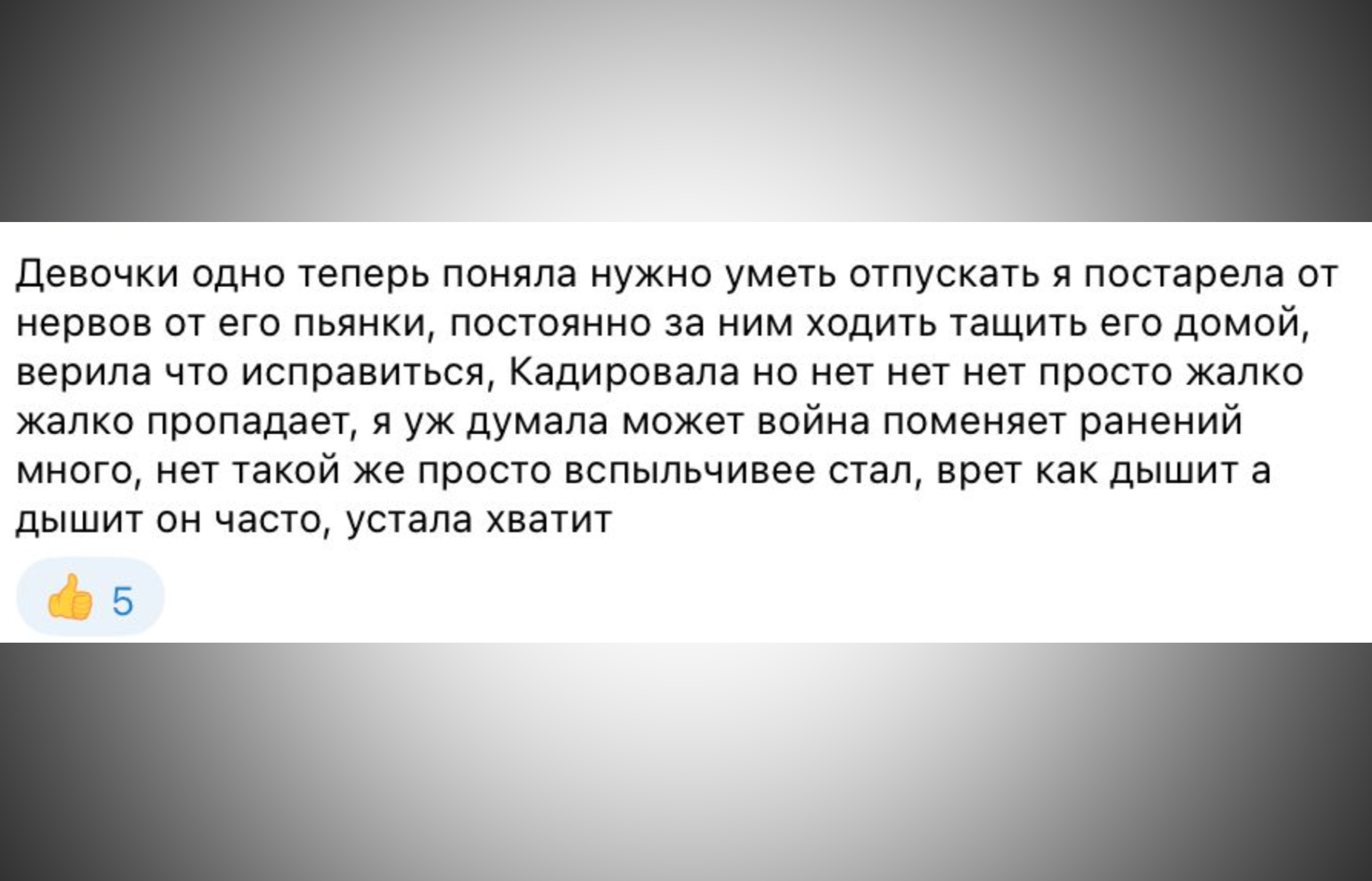 В чатах, где жены и родственники завербованных заключенных пишут о их возвращении или невозвращении с войны, также царит особая атмосфера. Скорбящие женщины радуются, если их супруги остаются живыми, и опускают подробности их биографий. О том, что те убивали людей в Украине, женщины стараются не говорить. Многие пишут про «защиту Отечества». Тех, кто поднимает вопрос о прошлом экс-заключенных, быстро затыкают другие женщины. Один из диалогов: