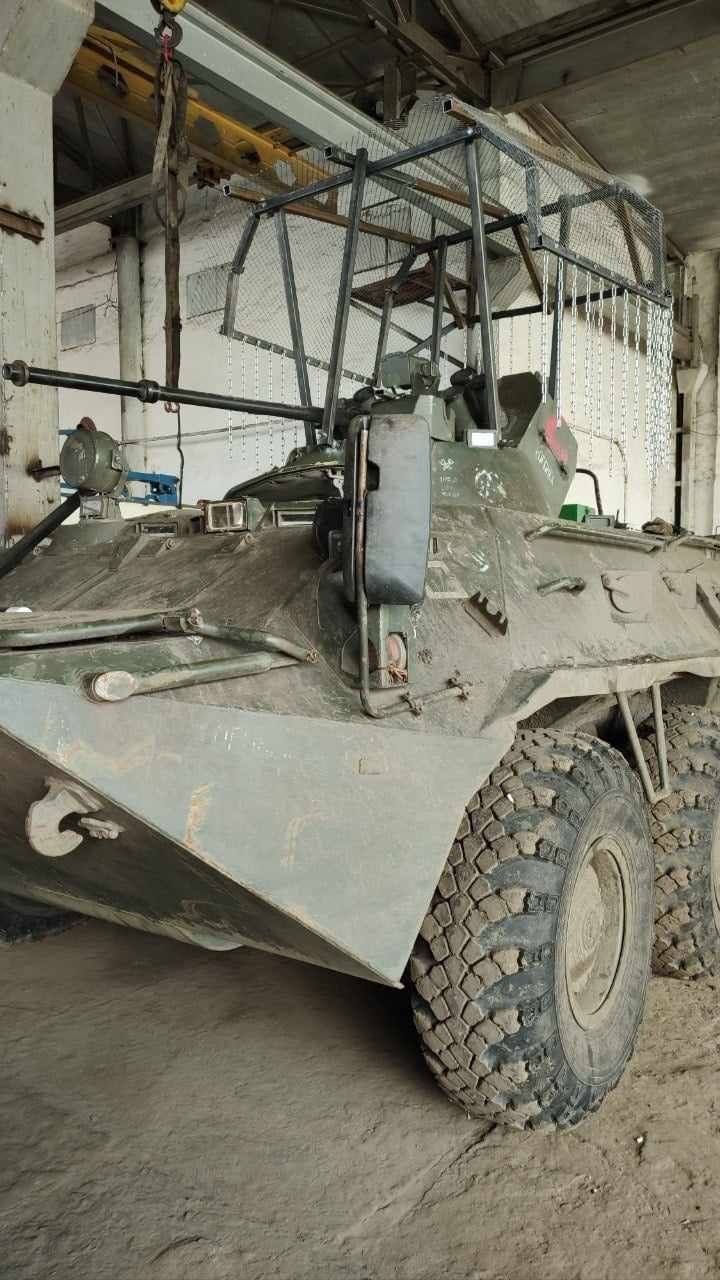 Появились фотографии российского БТР-82А, оборудованного не только антидронным «мангалом», но и свисающими с него металлическими цепями.