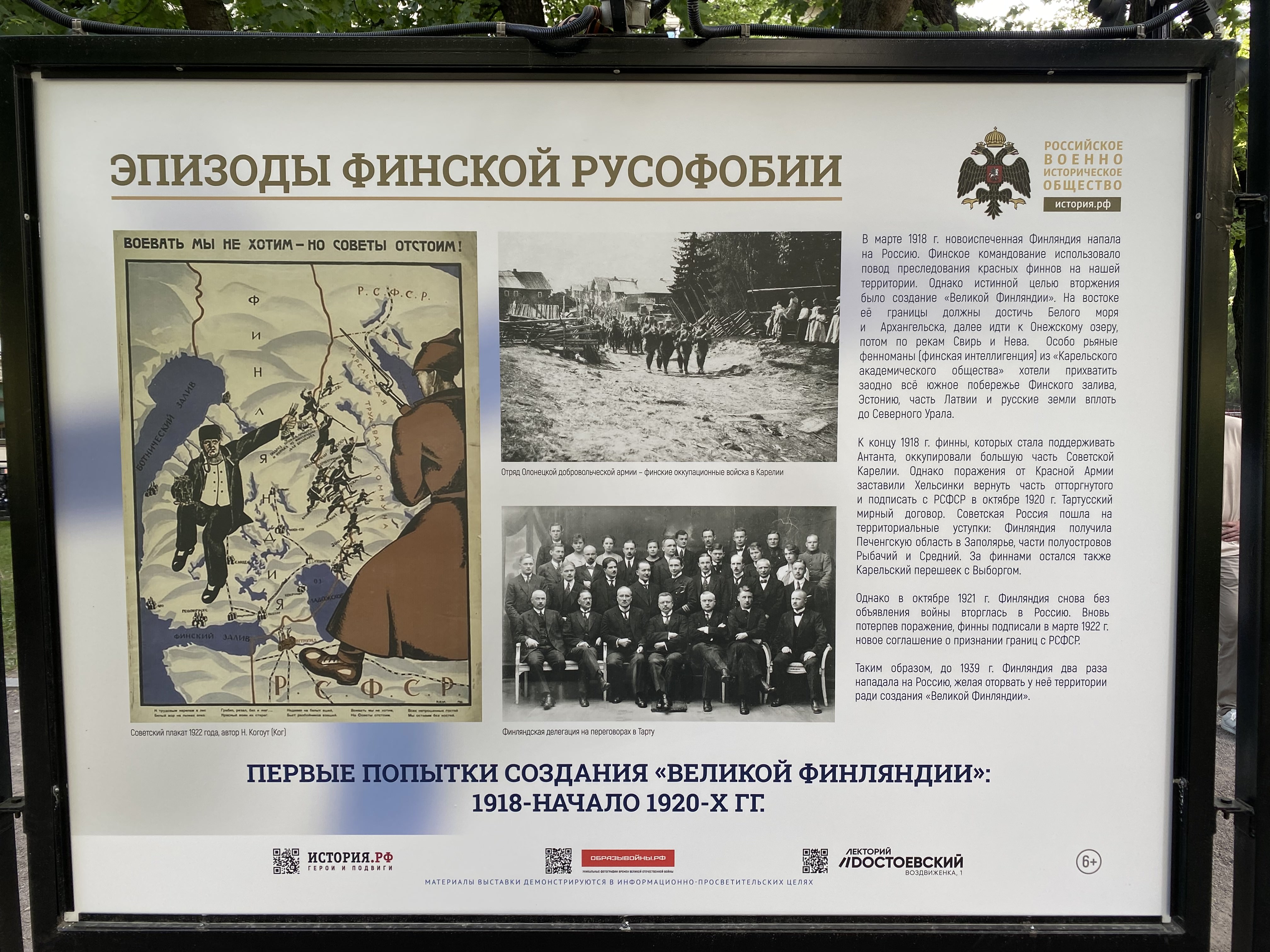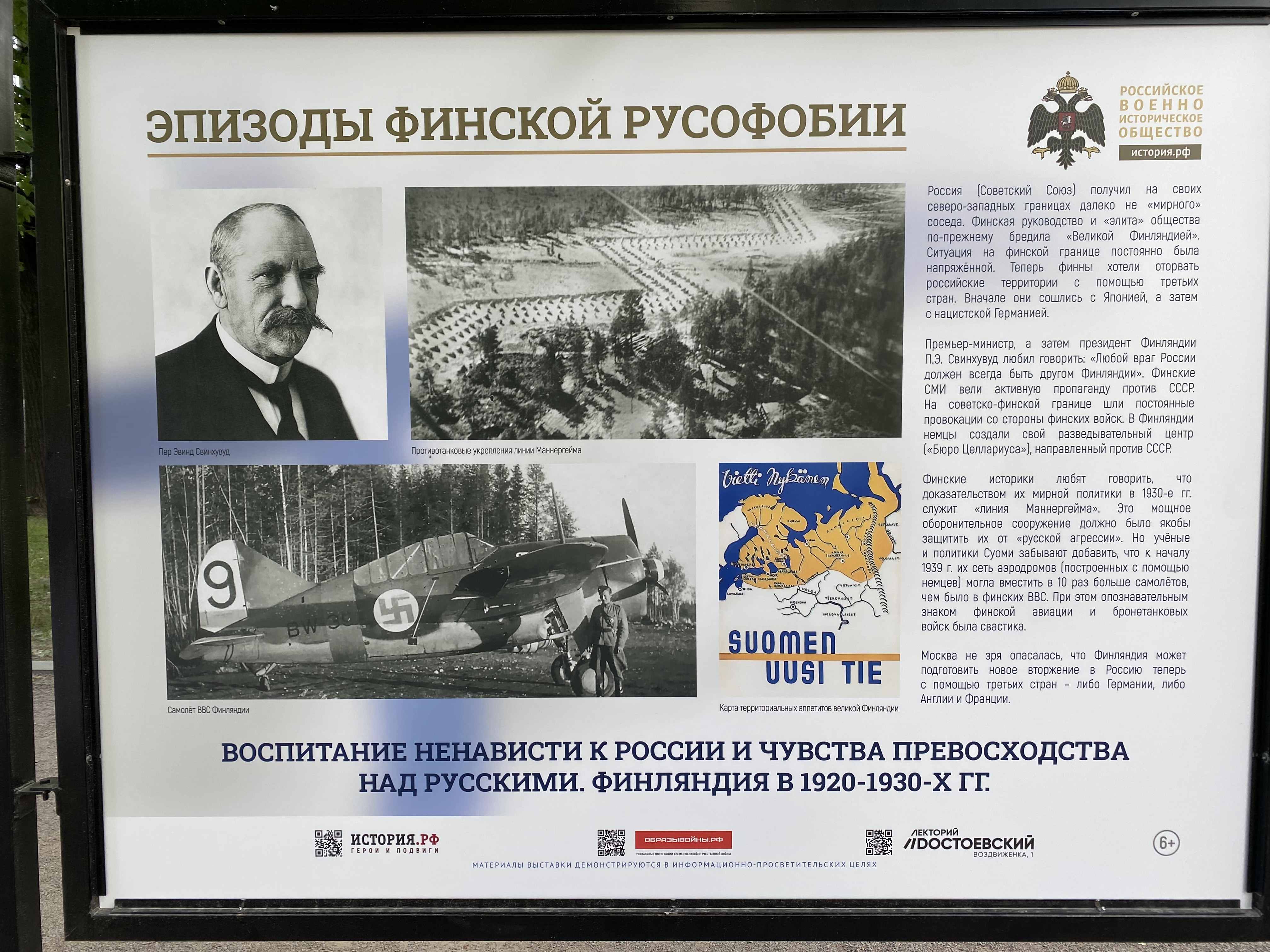 В Москве на уличных стендах проходит выставка Российского военно-исторического общества (РВИО) под названием «Эпизоды финской русофобии». В материалах выставки Финляндию называют «жалкой колонией Швеции», которая получила все права и свободы только после присоединения к России, а также рассказывают, что виновниками массовых расстрелов в Сандармохе были финны, а вовсе не НКВД.