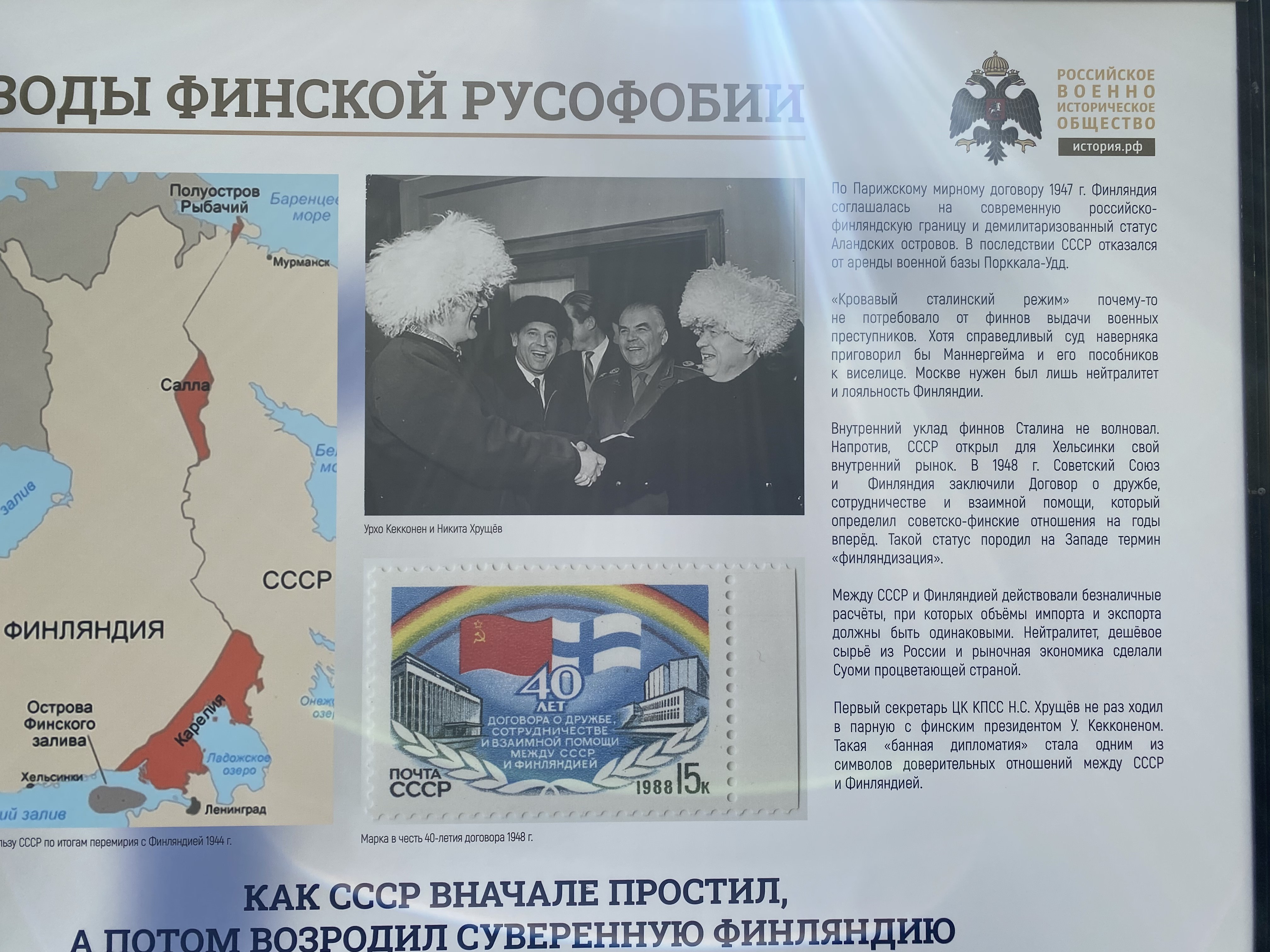 Выставка расположена сразу в трех местах: напротив посольства Финляндии в Кропоткинском переулке, по дороге от посольства к метро «Парк Культуры» на Остоженке и на Гоголевском бульваре. Текст на 16 стендах содержит множество орфографических и пунктуационных ошибок. В материалах делается акцент на том, что именно в составе России Финляндия обрела государственность и независимость, при этом именно «по вине финской стороны за первую половину ХХ в. наши страны, имели 4 вооруженных конфликта» (пунктуация и орфография авторов здесь и далее сохранены).