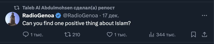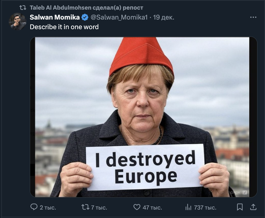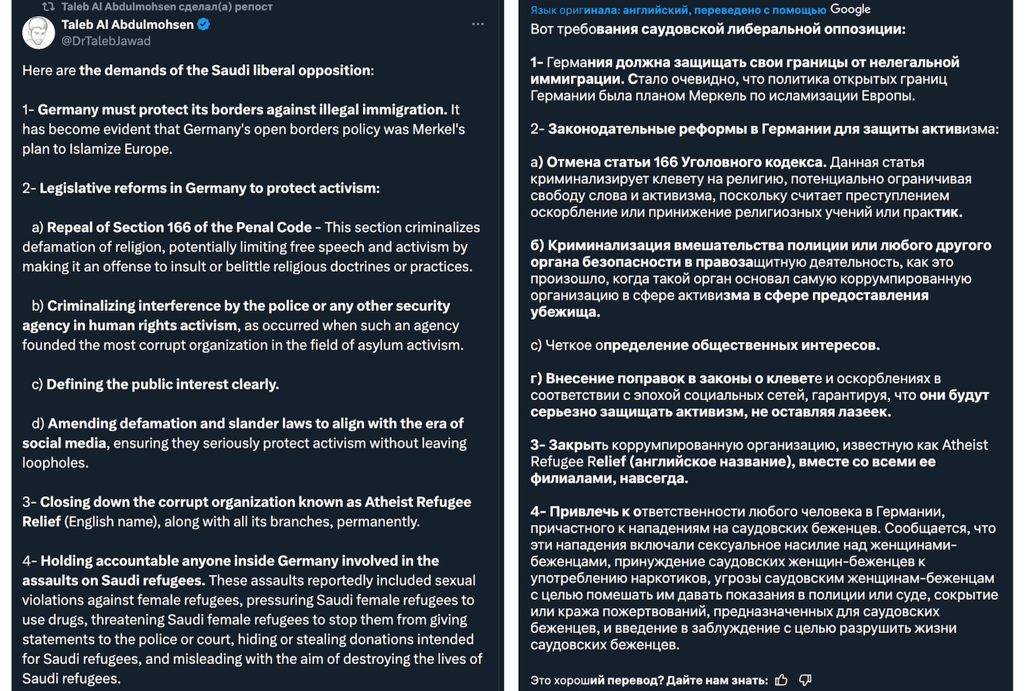 Выходец из Саудовской Аравии Талеб аль-Абдулмохсен, въехавший в людей на рождественской ярмарке в Магдебурге (Германия), активно репостил праворадикальные заявления в Twitter. В том числе заявления, восхваляющие партию «Альтернатива для Германии» и пост блога Radio Genoa, известного ксенофобными, антиисламскими нарративами.
