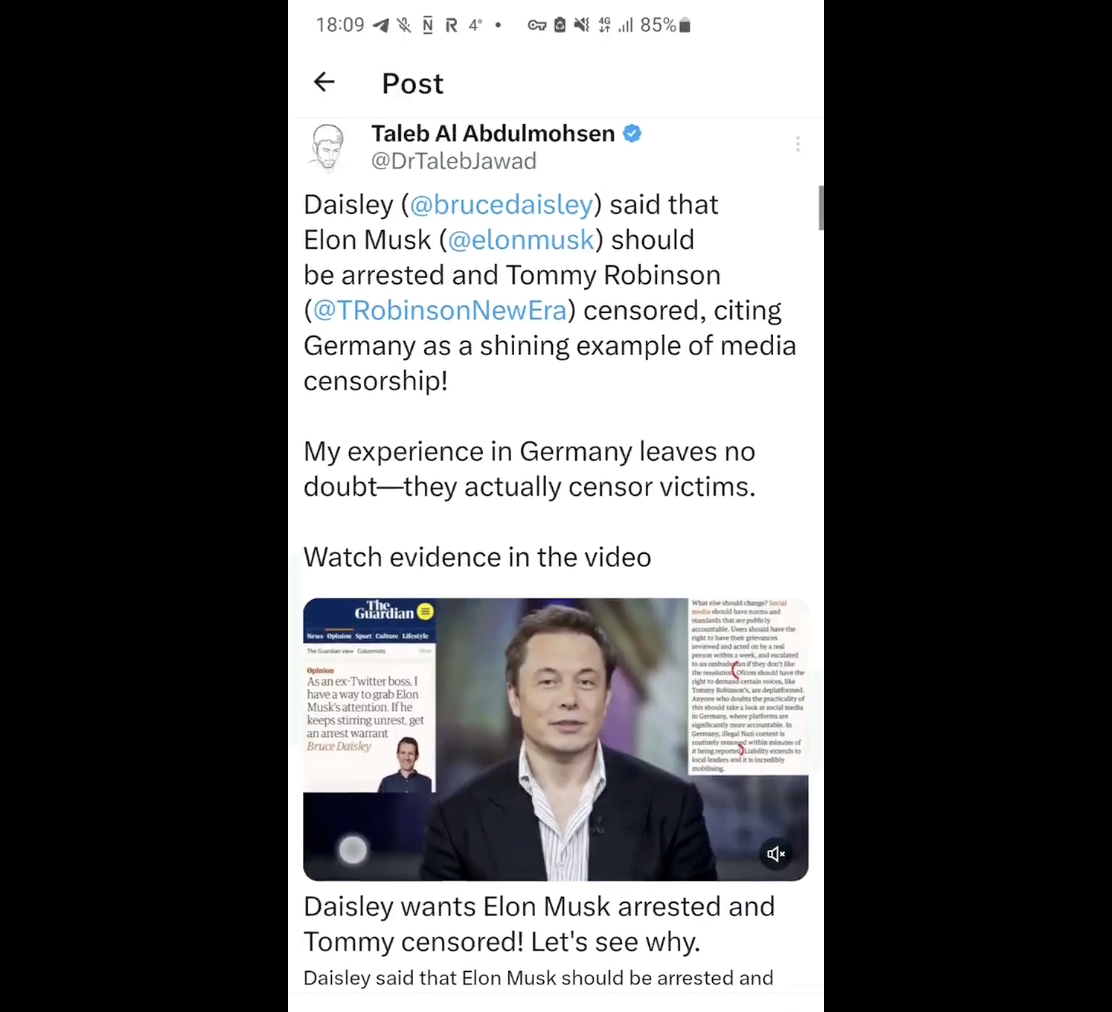 Свою последнюю публикацию аль-Абдулмохсен сделал сам — он снова опубликовал старую запись о том, что бывший топ-менеджер Twitter Брюс Дейсли требовал арестоватьИлона Маска, к записи добавлено видео с «реакцией» самого Маска на это заявление. В действительности реакция Маска — это дипфейк. Аль-Абдулмохсен пишет, что Маска сделали жертвой цензуры. Эту запись он сделал через несколько часов после публичного заявления Маска о том, что «только АдГ может спасти Германию».
