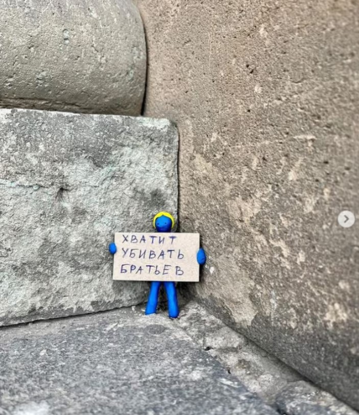 Сюда же можно отнести акцию художника Андрея Андреева, который прикручивал пробитые пулями украинские номера к своей машине и ездил по городу. После задержания ему удалось покинуть Россию. Но, пожалуй, самым «доходчивым» проектом до сих пор являются антивоенные надписи на денежных купюрах и даже монетах.